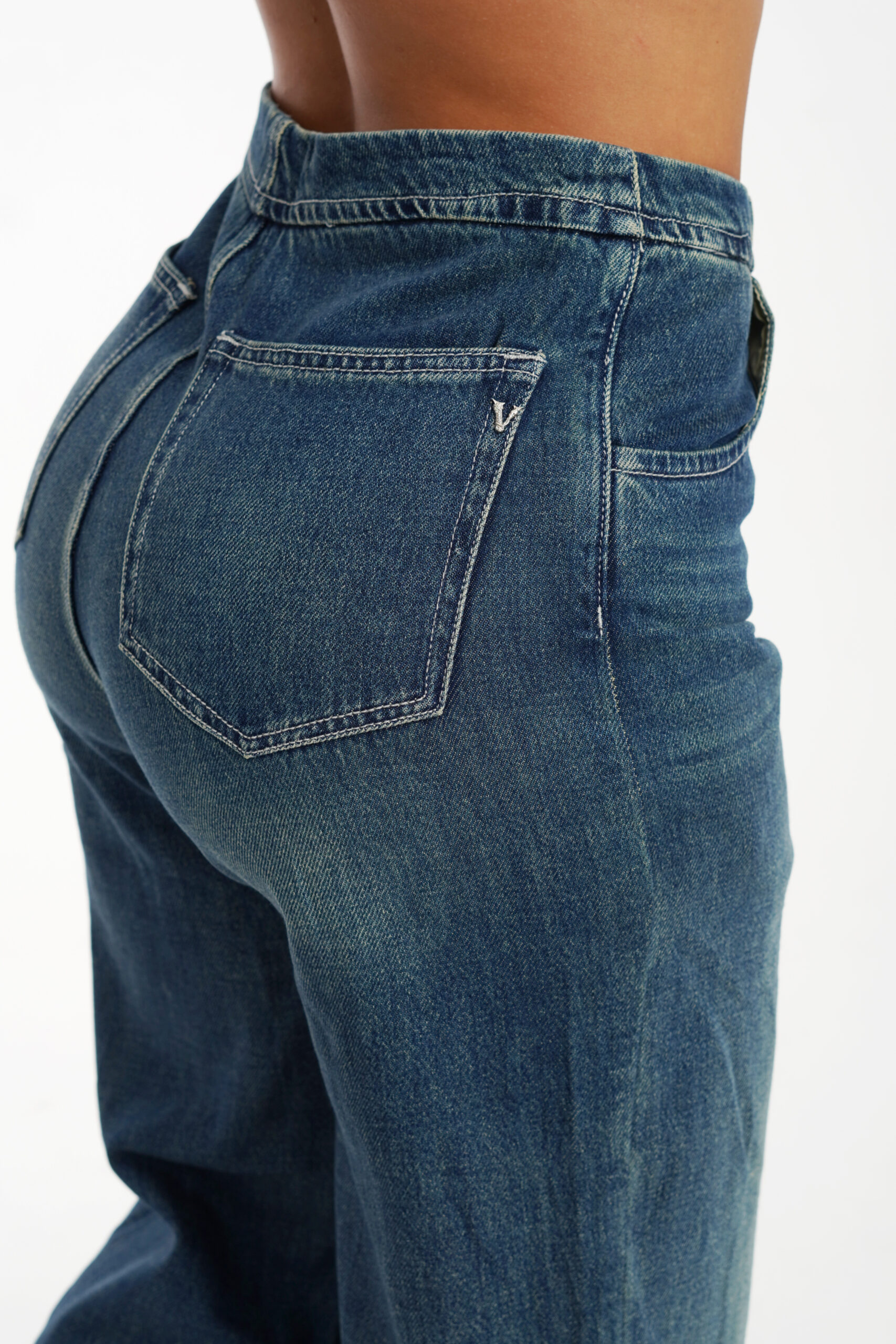100 % algodón – sin stretch. Tiro alto, tono índigo oscuro y botones metálicos que le dan un toque vintage y diferente.