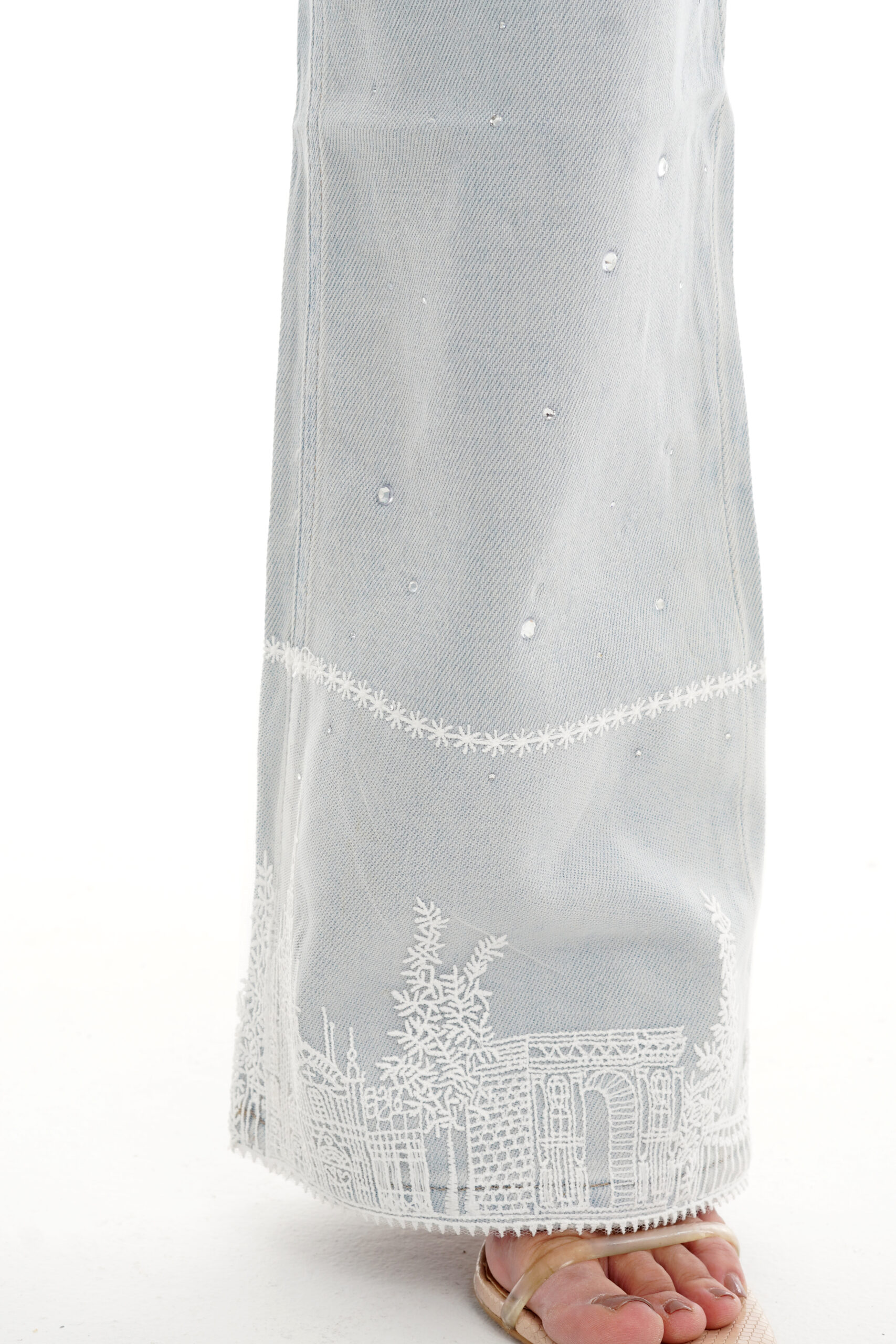 Detalle de pedrería sutil distribuida en todo el jean
