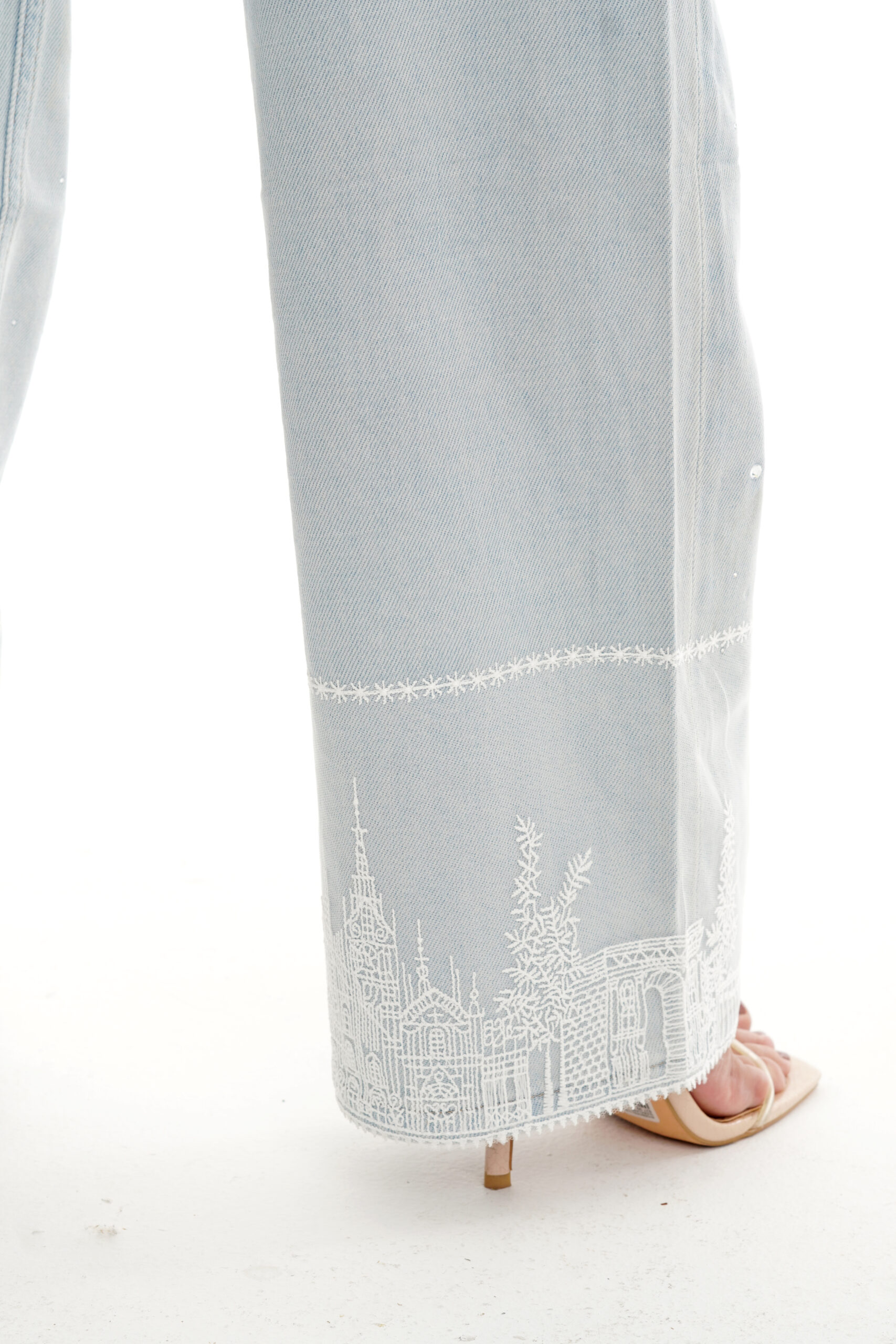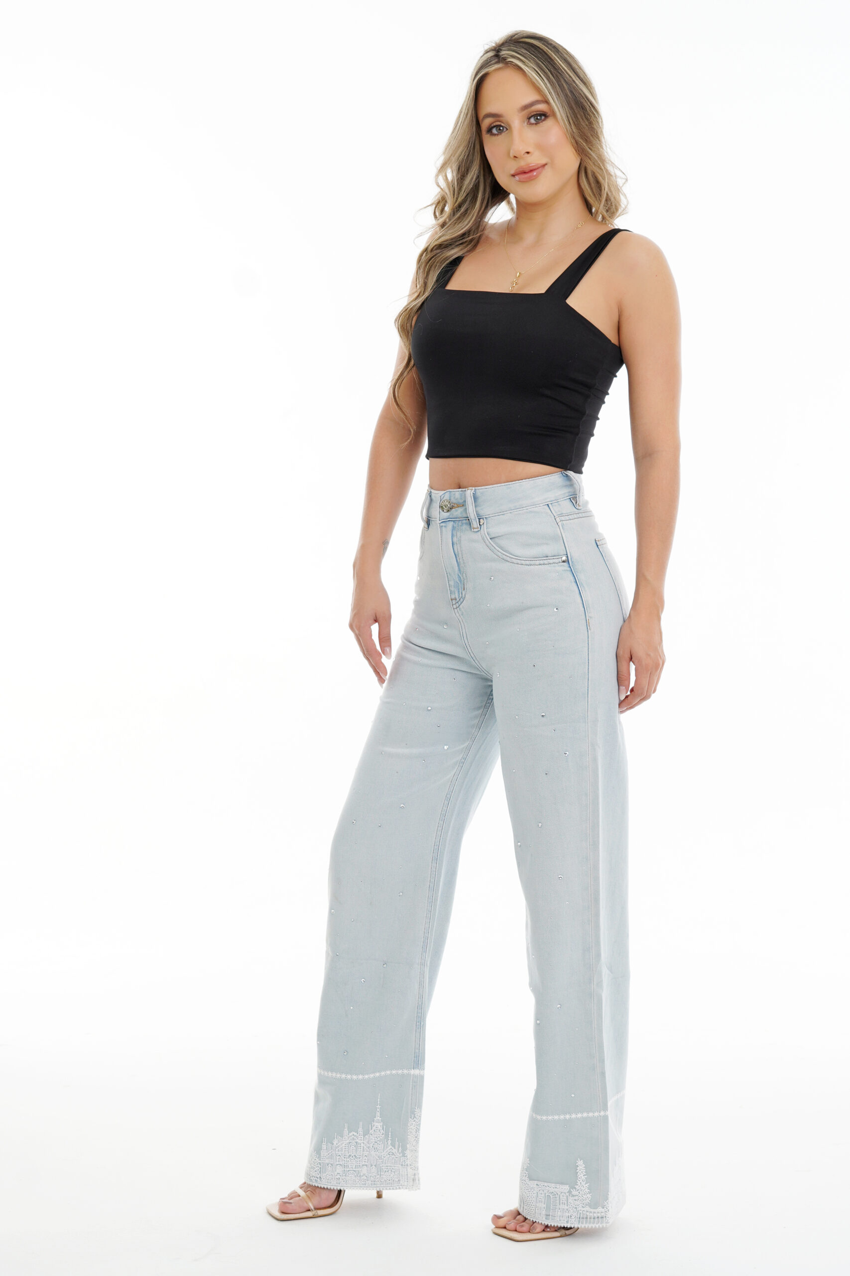Este Jean Wide Leg en tono claro es una joya para tu clóset. Diseñado para mujeres delgadas que buscan elegancia sin esfuerzo, su tiro alto estiliza la figura, mientras que el detalle de pedrería delicada en todo el cuerpo del jean y el encaje bordado en el ruedo lo convierten en una pieza única y femenina.